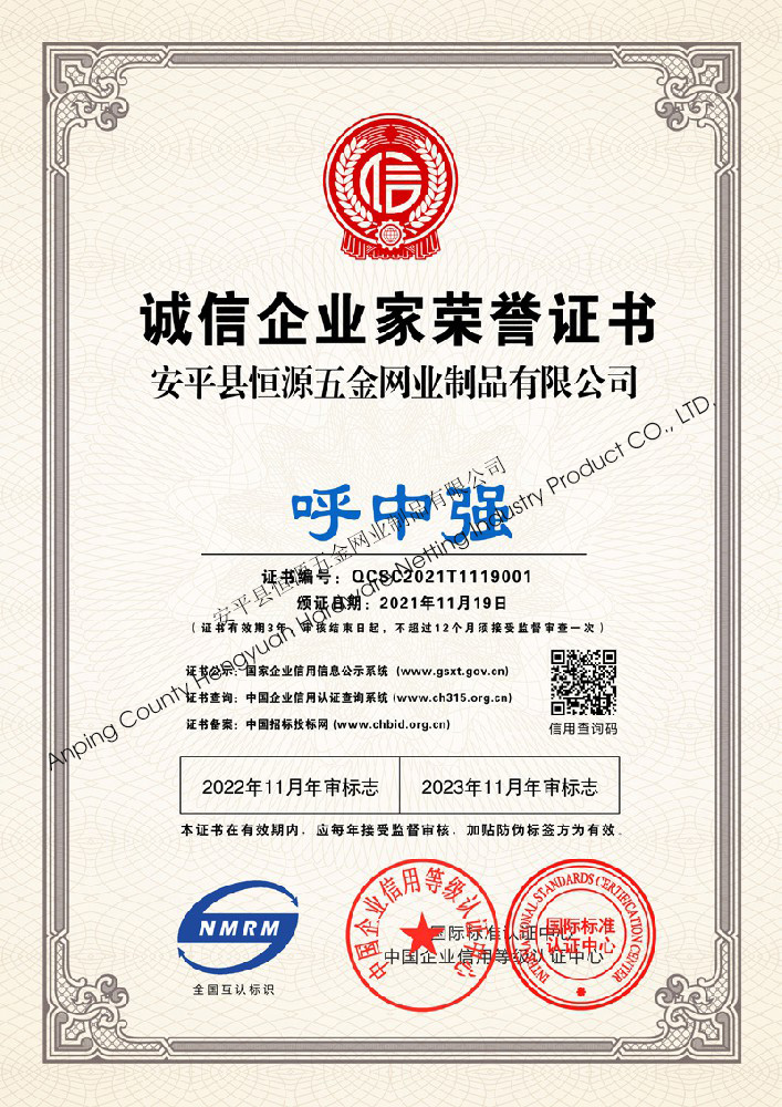 安平縣恒源五金網(wǎng)業(yè)制品有限公司,位于“絲網(wǎng)之鄉(xiāng)” 河北省安平縣,其前身為安平縣礦篩網(wǎng)廠,成立于2006年,注冊(cè)資金300萬(wàn)元,是建廠時(shí)間較早、生產(chǎn)銷(xiāo)量較大的礦篩網(wǎng)骨干企業(yè)。